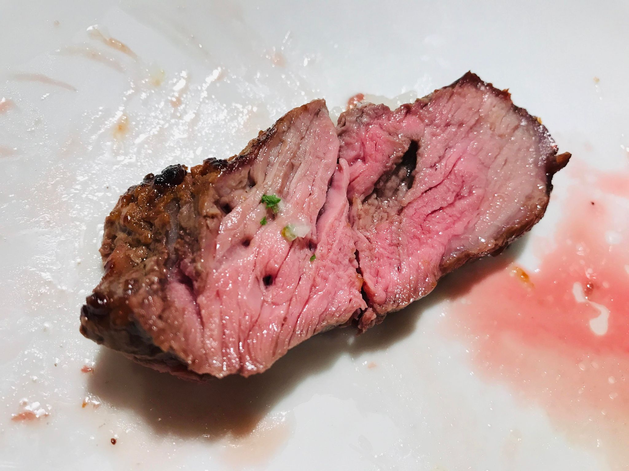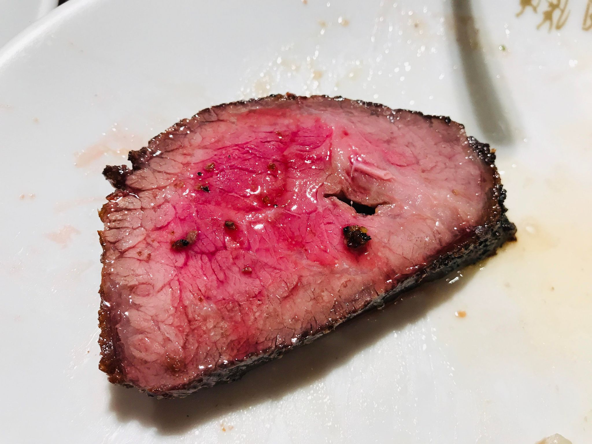 こちらは希少性の高い部位なので、薄く切り分けて頂きます。脂身が少なく、繊維がやわらかい赤身のお肉です。お口の中でとろけるようです。