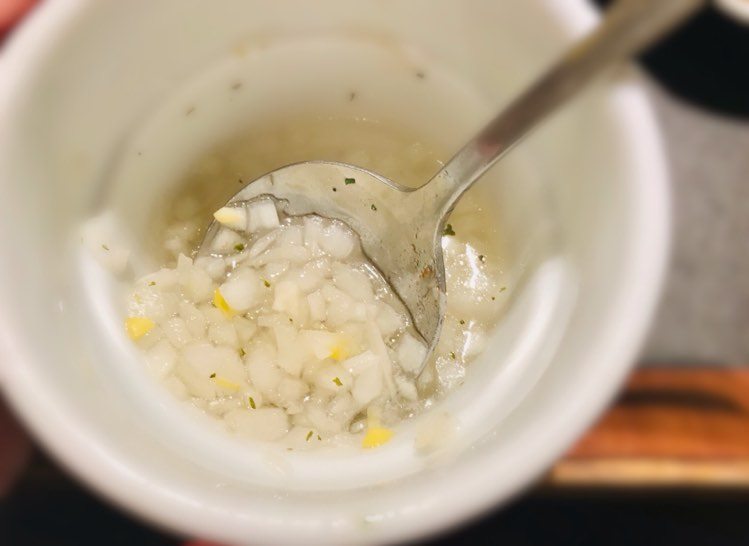 こちらの玉ねぎソースが超~美味。うまみの効いた、さわやかなレモン風味でハマります。このソース、自宅にも欲しいぐらい。