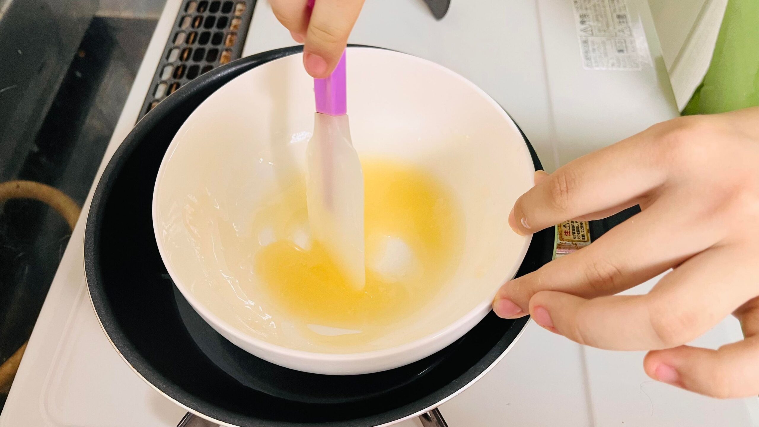 ふやかしておいたゼラチンを湯せんして、溶かします。