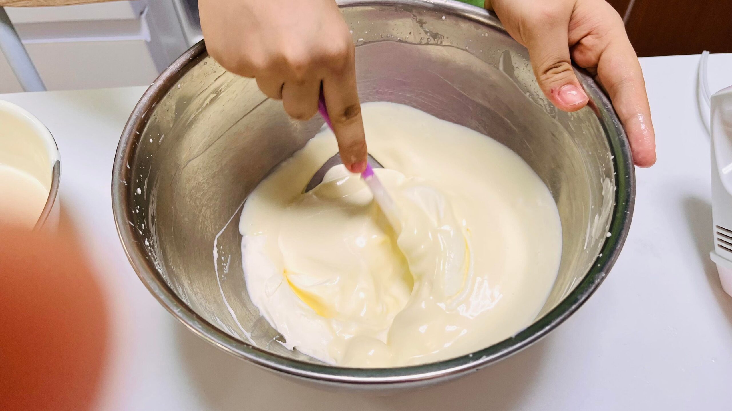 ゼラチンを入れた際にチーズクリームが冷たいままだと、このようにゼラチンとチーズが分離してしまいます。