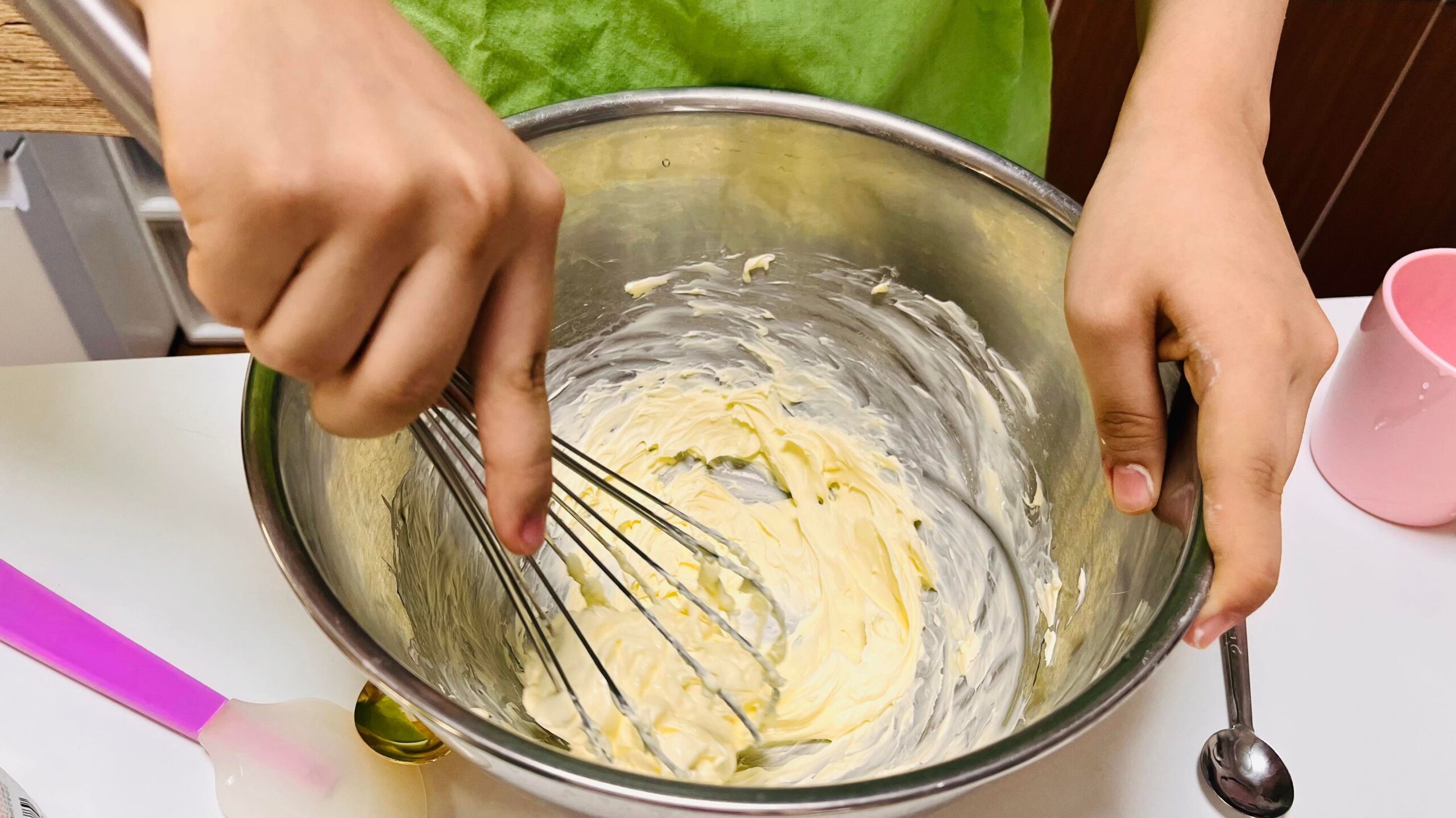 泡立てた生クリームにチーズクリームを少しづつ加え、ゴムベラで切るように混ぜます。
