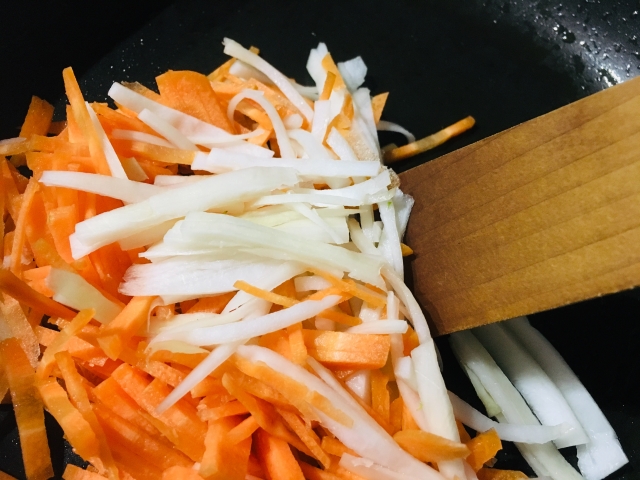 しっかり火が通るまで炒めますし、しょうゆとみりんでしっかり味付けします。