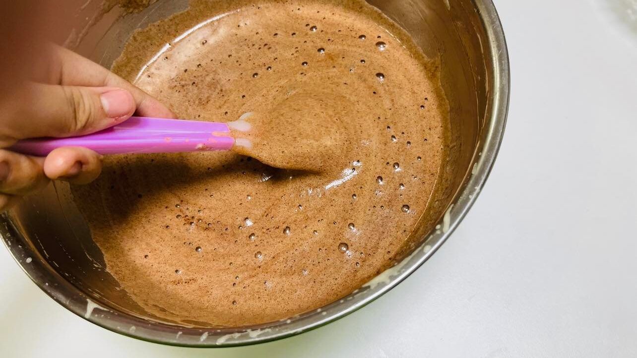 溶かしバターとパルスイートを入れ、再びゴムベラで混ぜます。これでチョコレートは完成です。簡単に作れちゃいます!