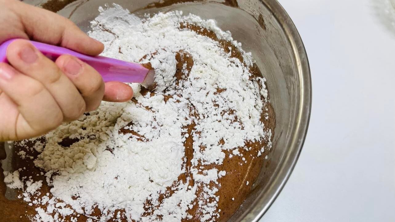 粉類を全体的に振りかけ、ゴムベラで切るように混ぜます。1度に全部入れるとダマになる可能性があるので、数回に分けて入れましょう。決して混ぜすぎないように。