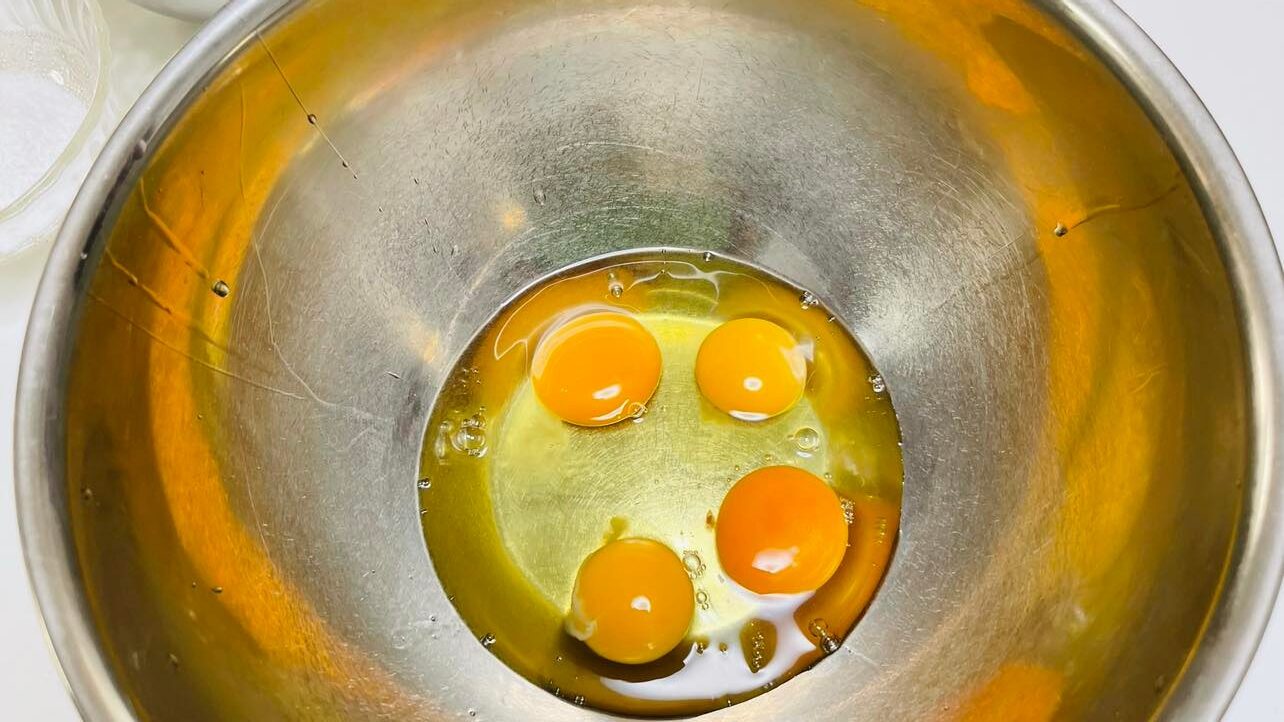 次は生地を作ります。ボウルに卵を4個を割り入れます。