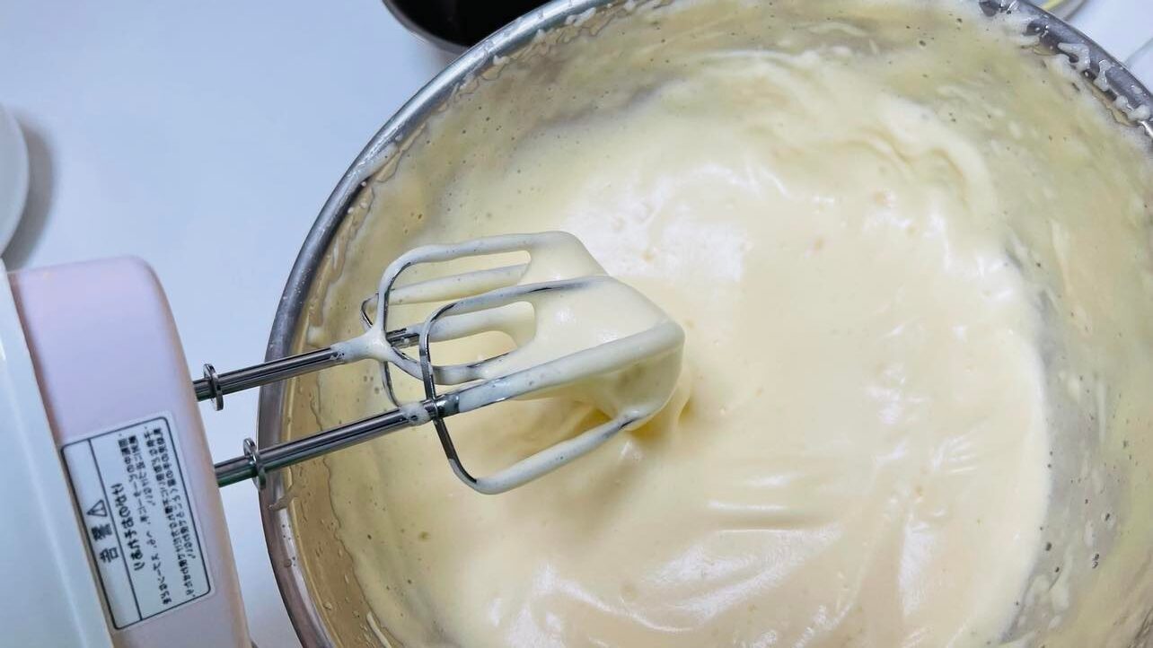 ハンドミキサーで白っぽくなるまで泡立てます。