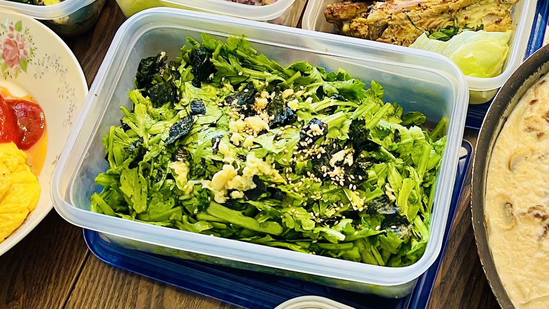 味付けの王道パターン→鶏ガラ+にんにく+しょうゆ+ごま油