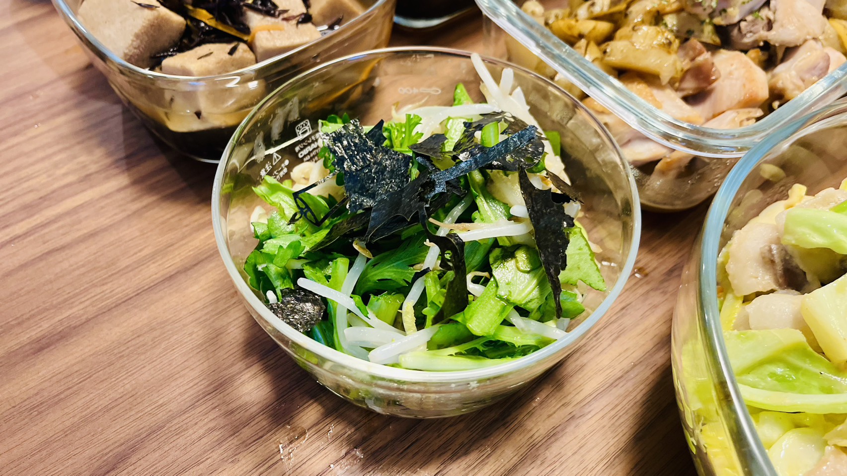 春菊ともやしバージョン:ねぎとセレベスのピリ辛和え|大阪料理代行おマミ