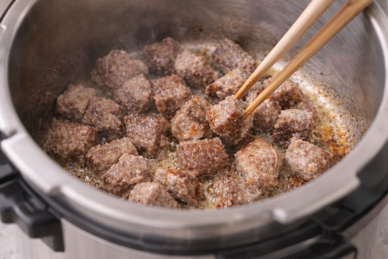 3. 圧力鍋を熱し(予熱)、オリーブ油、牛肉を入れて焼き色をつけ、表面を焼き固める