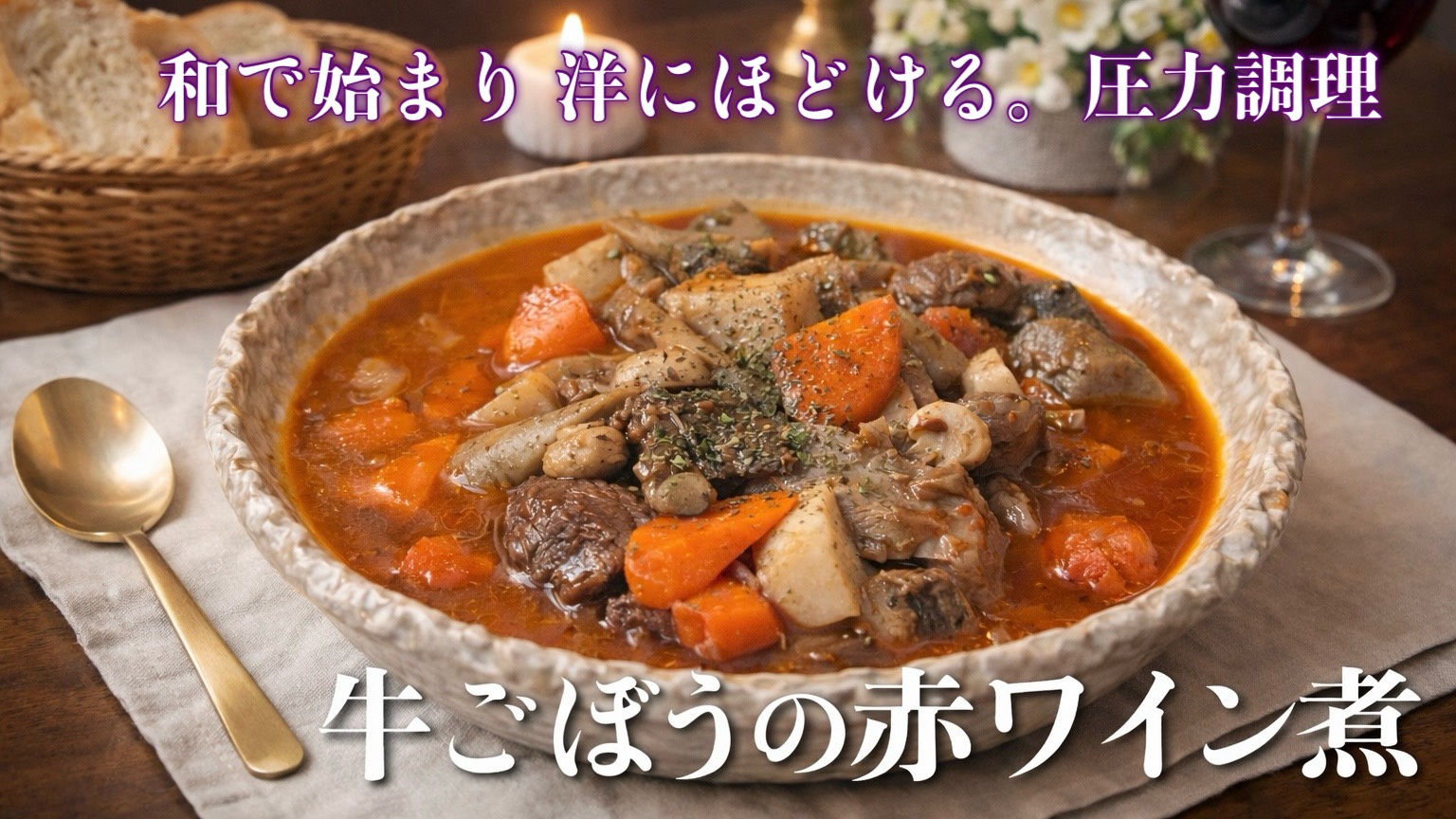 牛の旨みとごぼうの香りを引き出すひと工夫で、「和で始まり、洋にほどける」プロみたいな一皿に仕上がります。