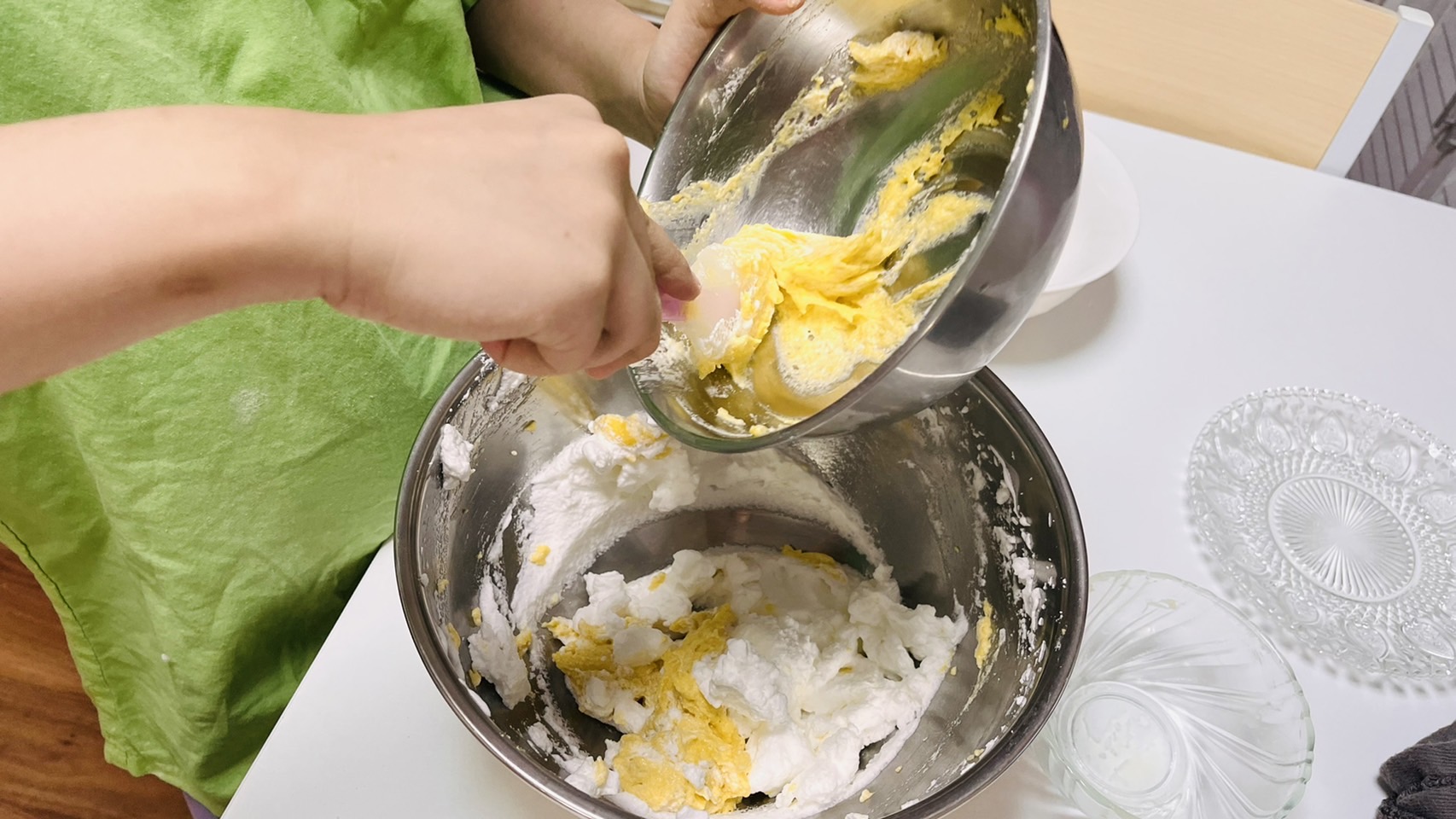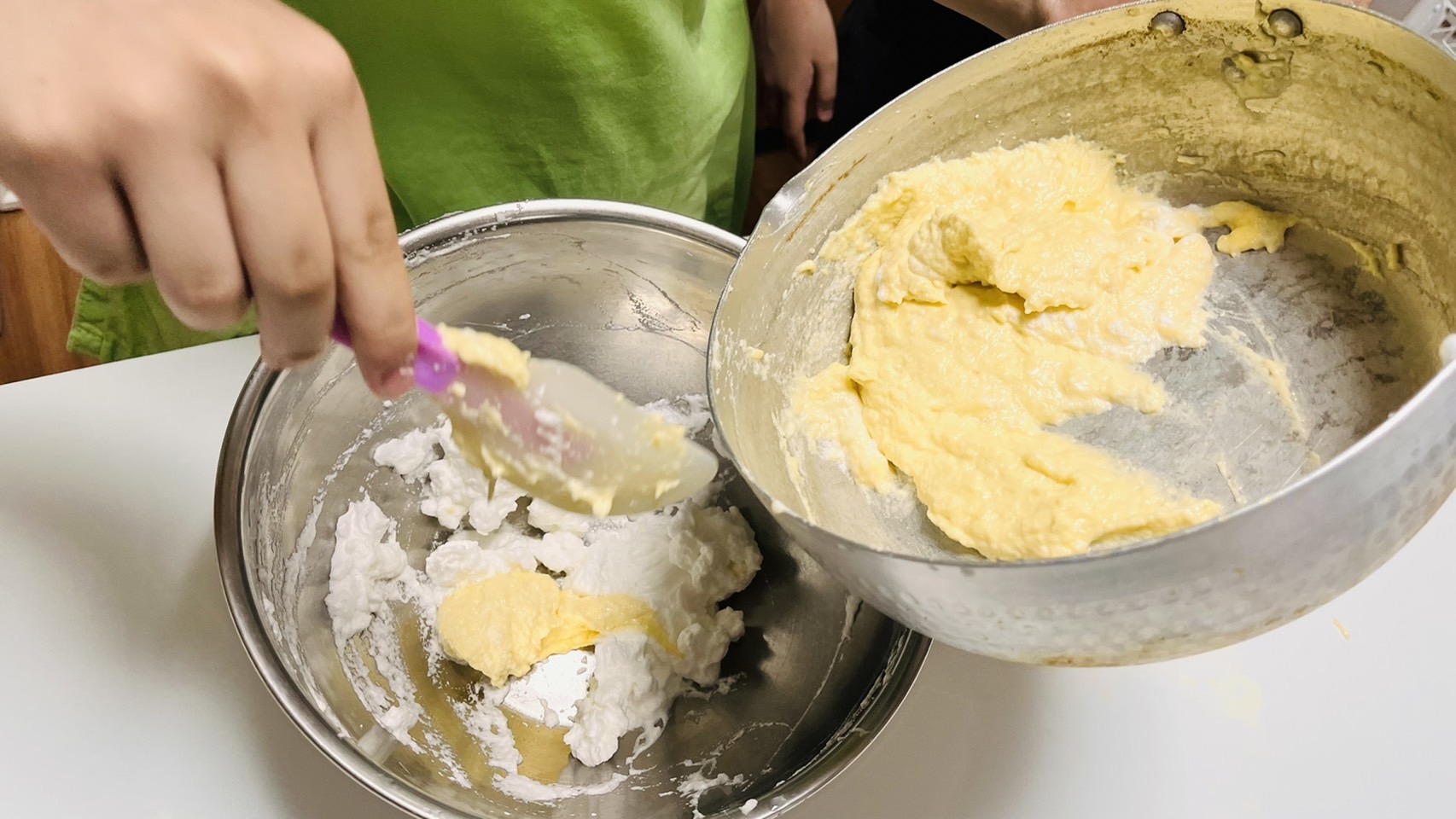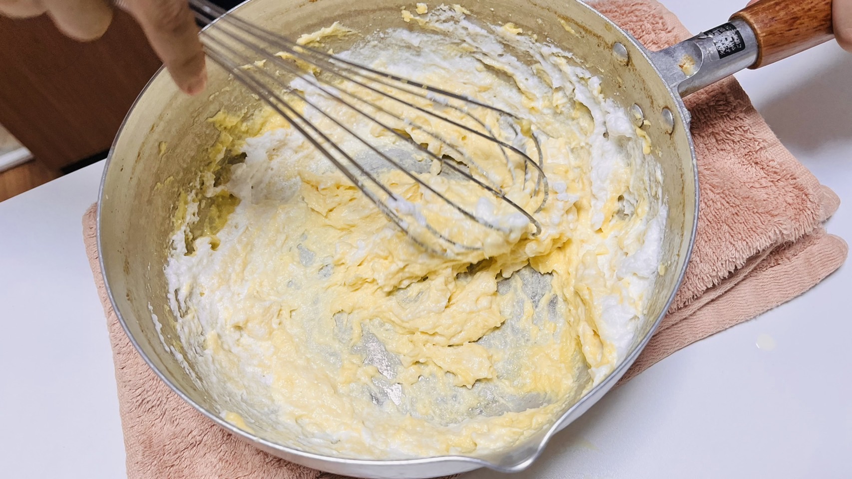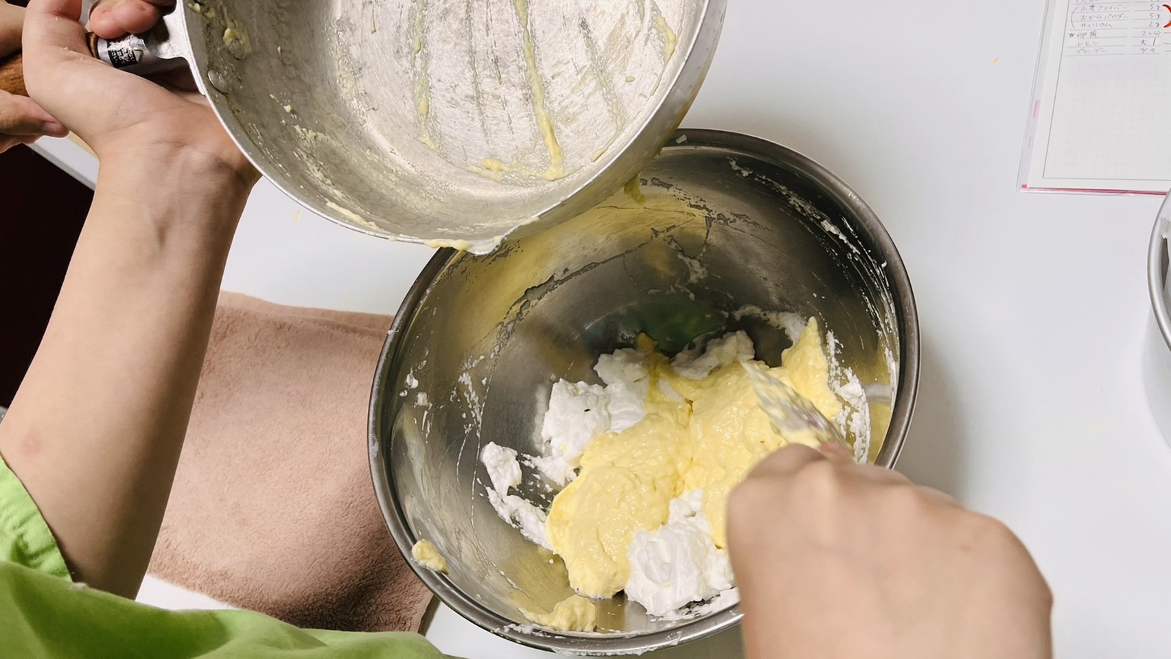 泡立てた卵白(メレンゲ)を少しずつ入れて、なじませていきます。