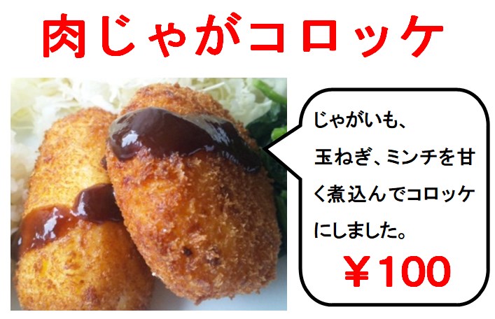 肉じゃがコロッケが一番人気メニューでした。ジャガイモ、玉ねぎ、ミンチを甘く煮てからコロッケにしています。