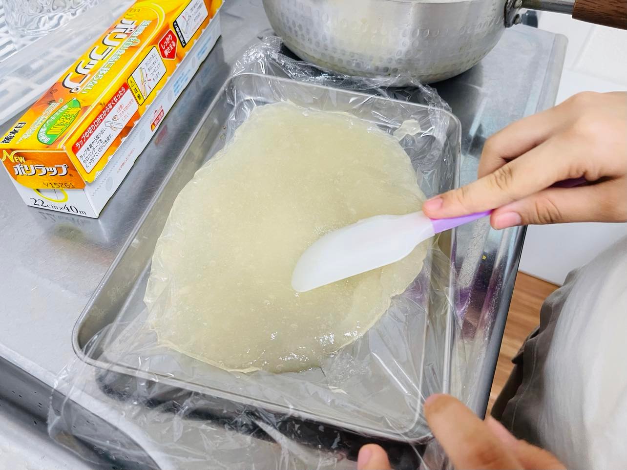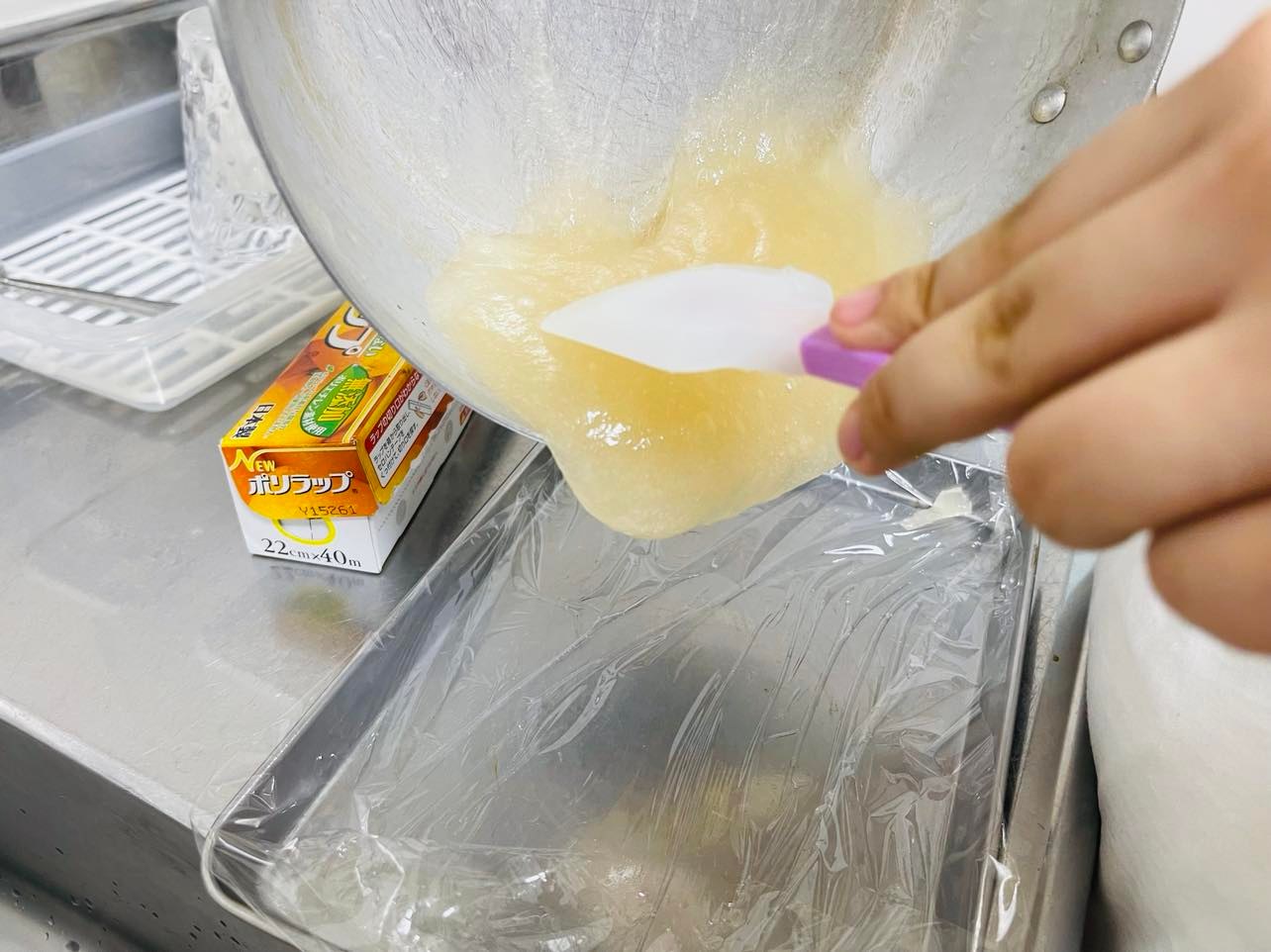 ラップをひいたバットに入れます。