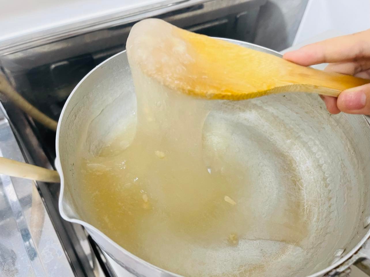 スライムのような硬さになるまで、弱火で温めます。下の図のような状態になったら火を止めます。